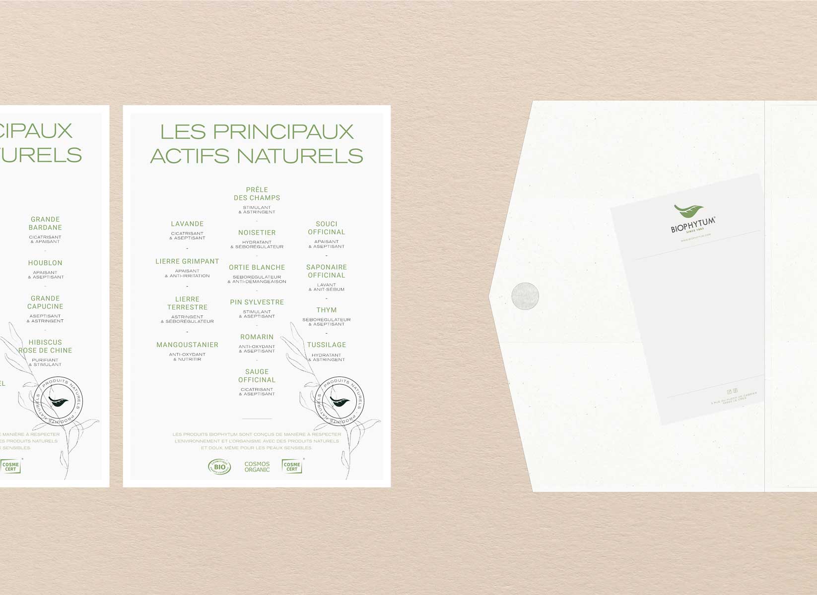 Biophytum est une marque française centenaire, pleinement engagée écologiquement dont les produits sont certifiés Bio et Vegan. D'origine Montpelliéraine, elle tire ses origines de la parfumerie Monternier. Le studio a accompagné la marque dans la conception de leur identité visuelle supports papier.
